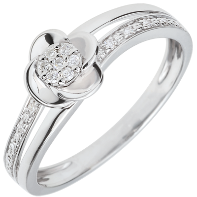Petalele acestui trandafir sunt deschise spre o inimă de diamante pentru eternitate. Un inel de logodnă din aur alb proaspăt şi feminin.
