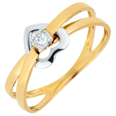 O inimă din aur alb în echilibru între două inele de aur galben peste care se află un diamant încrustat în aurul alb.