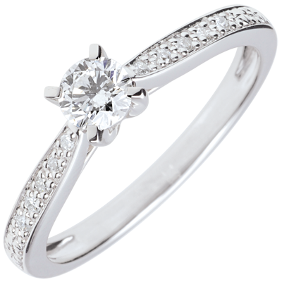 Un diamant solitaire este ţinut de 4 gheruţe pe o montură rafinată încărcată de diamante.