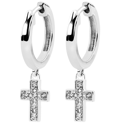 Cercei creole din aur alb cu prelungiri cruce încrustate cu diamante. O imagine pioasă regândită într-un stil contemporan, un pic "rock".