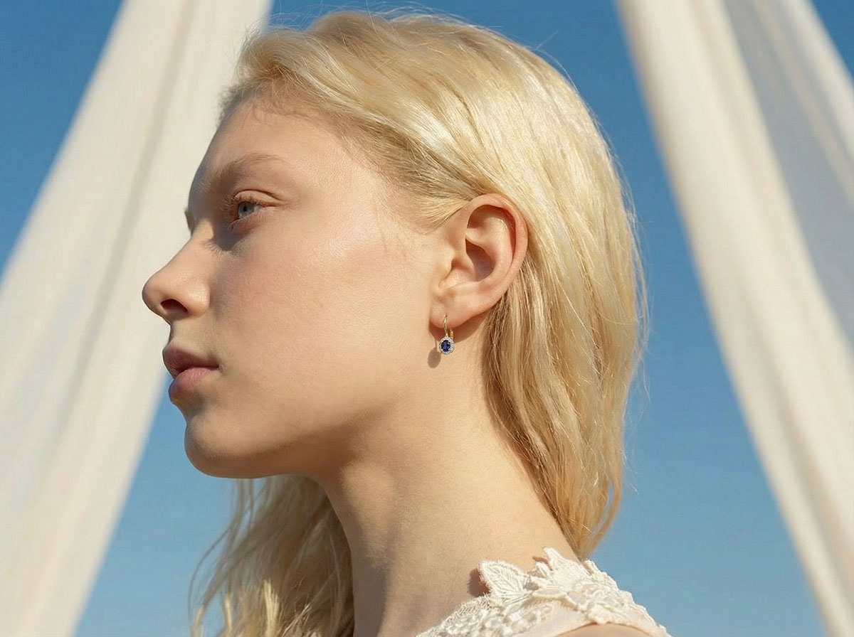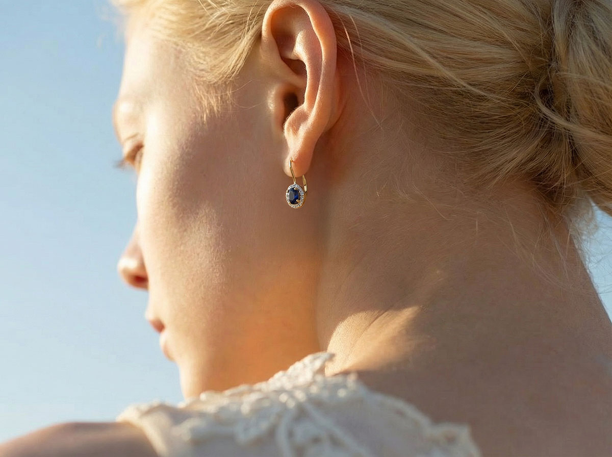 Acești cercei au 2 safire albastre ovale cu greutatea totală de 0,92 carate și 4 diamante cu greutatea totală de 0,02 carate.