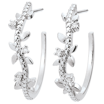 O alternanţă de frunze de aur alb strălucitoare şi de frunze cu lustru periat manual pentru creole romantice încrustate cu 6 diamante.