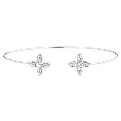 O brățară elegantă din aur alb închisă de doi trifoi incrustați cu diamante strălucitoare. Un talisman blând, care doar ce a înflorit.