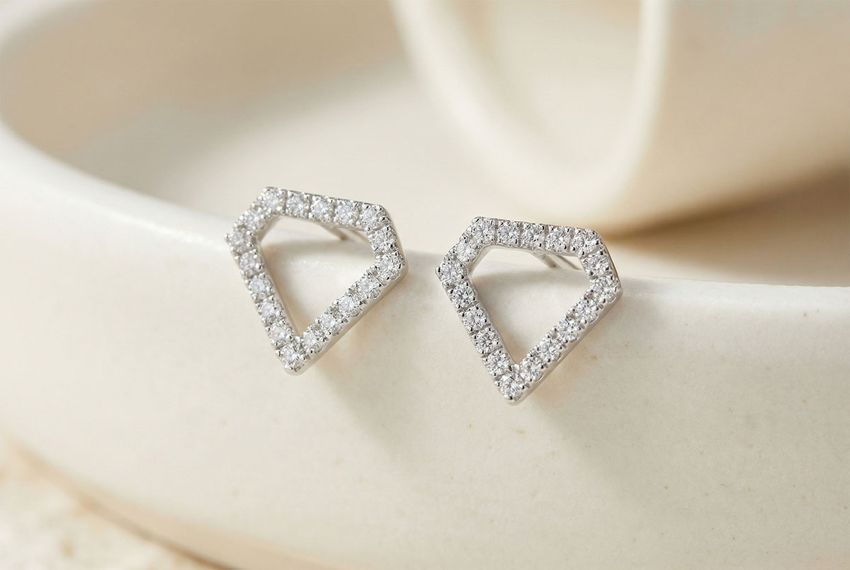 O pereche de cercei grafică şi minimalistă, cu contururi pavate care celebrează silueta unui diamant.