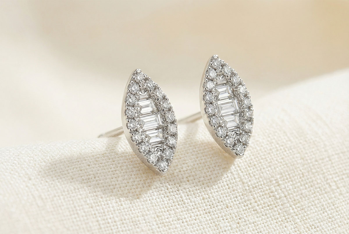 O trilogie de diamante tăiate baghetă, subliniată de un pavaj de diamante, într-o pereche de cercei fină şi feminină, cu forme inspirate din poveştile orientale.