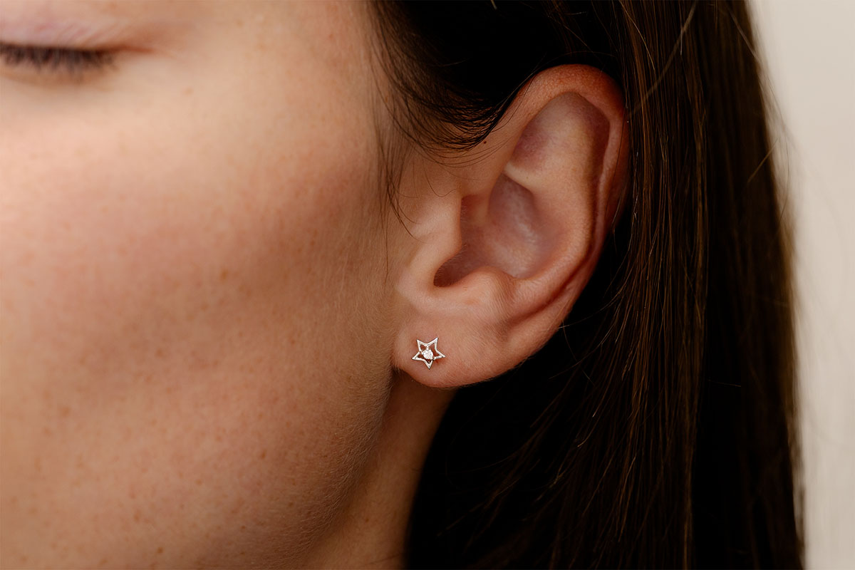 Model iconic sub formă de stea, încrustat cu un diamant, regândit într-o pereche de cercei discreţi şi unici.