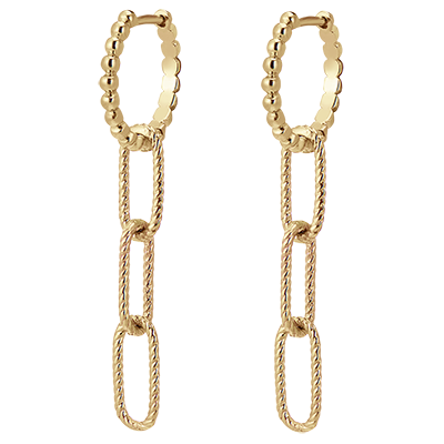 Un trio de zale din aur galben ușor răsucite ce se leagănă pe un inel din aur perlat. O pereche de cercei lungi, moderni, cu un aer rock.