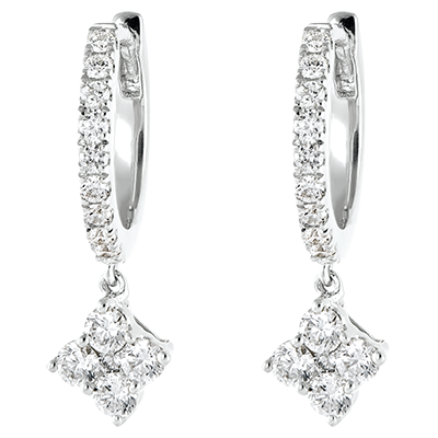 O pereche de creole din aur alb semi-pavate cu diamante al căror canaf încrustat cu un careu de 5 diamante adaugă o notă prețioasă și modernă în același timp. Canaf 5.95mm pe lateral și 3.20mm grosime.