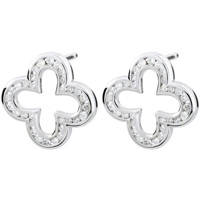 Două trifoiuri cu 4 foi stilizate şi bogat pavate cu diamante pentru cea mai frumoasă strălucire.