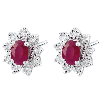 Pe fiecare cercel cu şurub se află un rubin oval în centrul unei anemone din aur alb ale cărei petale sunt încrustate cu un diamant.