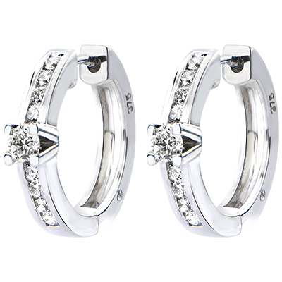 O pereche de mici creole semi-pavate şi evidenţiate de un diamant încrustat cu gheruţe. Un model feminin cu o scânteiere delicată.