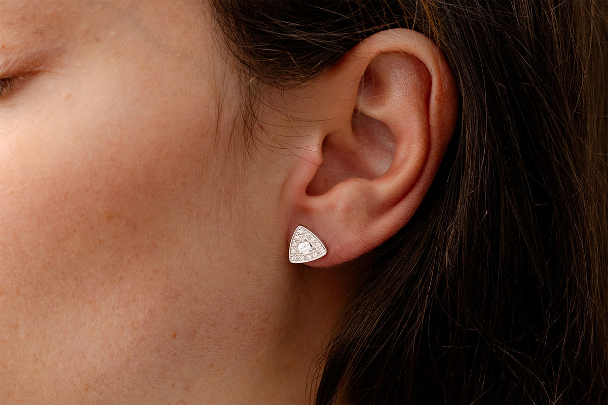 Cercei triunghiulari din aur şi diamante de o mare eleganţă ce împodobesc o femeie asemeni unui star de cinema.
