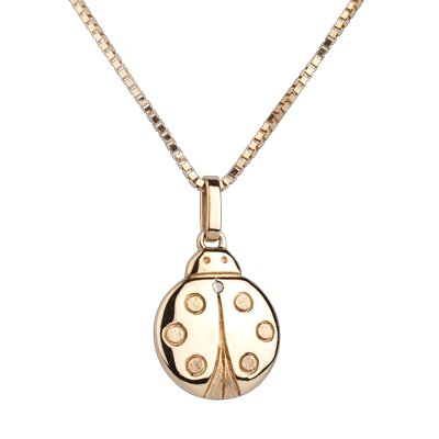 O buburuză din aur galben, model rotund şi blând, pentru a-i purta noroc. Al şaptelea punct este un diamant. Model mare