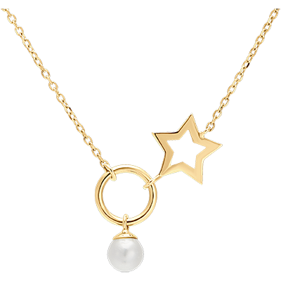 Un colier din aur galben împodobit cu un inel, o perlă ciucure și o stea, pentru un model plin de mișcare și lejeritate.