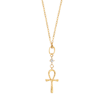 Un pandantiv Ankh delicat, lucrat minuțios din aur periat, cu diamant sintetic în centru.Simbol al vieții eterne în Egiptul antic, această bijuterie îmbină misterul și strălucirea cu o eleganță aparte.
