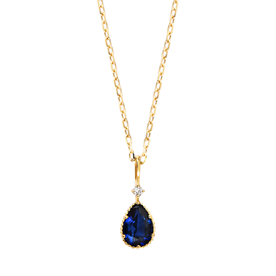 Un safir albastru de 0,5 carate, în formă de picătură fațetată, suspendat sub un diamant strălucitor.O bijuterie elegantă și luminoasă, ca o picătură de cer la gâtul tău.
