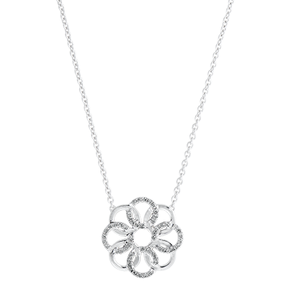 Pavaj caleidoscopic și unduiri alambicate pentru acest colier creativ și rafinat din aur alb. Lanț cu lungimea de 45cm și inel de reglare la 42cm.
