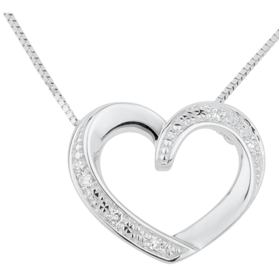 O inimă pavată de aur şi de briliante ce îi dau strălucire, suspendată de un lanţ veneţian din aur alb de 42cm.