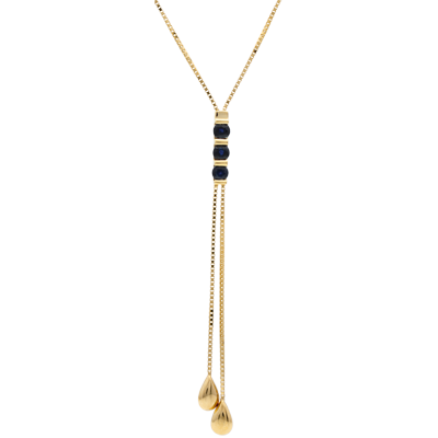 Două picături de aur sunt suspendate de braţele unei trilogii de safire. Zale lanţ veneţian.