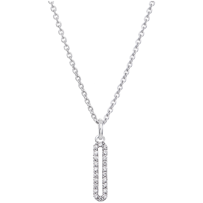 Un colier care regândește forma cartușului într-o versiune minimalistă și dantelată, cu contururi pavate cu diamante. O bijuterie care este cu siguranță simplă și delicată.
