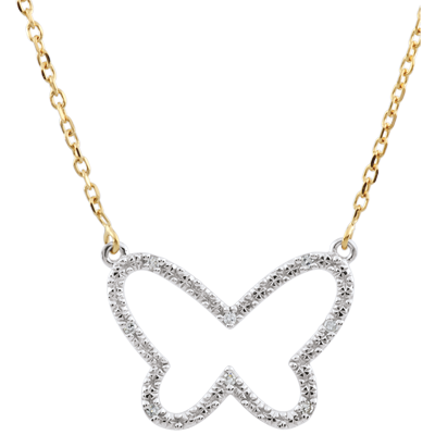 Un fluture din aur şi diamante al cărui contur este desenat la capătul unui lanţ de aur.
