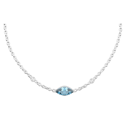 Preţioasa pupilă simbolizată de un topaz albastru tăiat marquise domină în centrul acestui lanţ fin de aur alb. Ea este înconjurată de două minunate diamante asemănătoare a două lacrimi îngheţate pentru totdeauna.