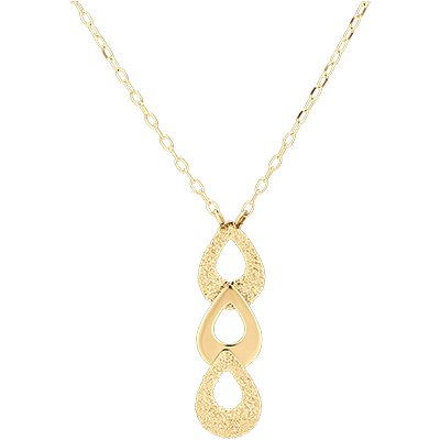 Un colier din aur galben cu desăvârșire modern. Împodobit cu un motiv de 3 pere asamblate împreună, două pere sunt din aur texturat - efect de diamant - iar o pară este din aur lustruit. Sigur îl veți adora