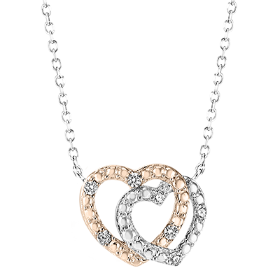 Acest colier, două inimioare din aur alb și aur roz lucrate asemeni diamantelor și încrustate cu diamante, inspiră tandrețe și complicitate.
