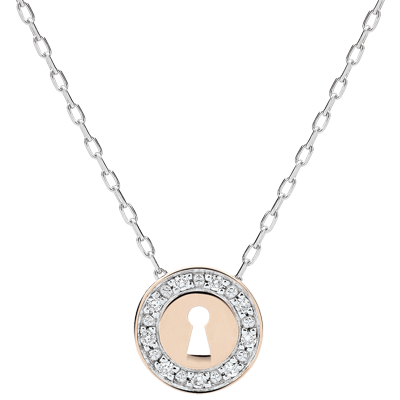 Un colier inimă din aur roz ce poartă o încuietoare este fixat pe un lanţ din aur alb împodobit cu două briliante.