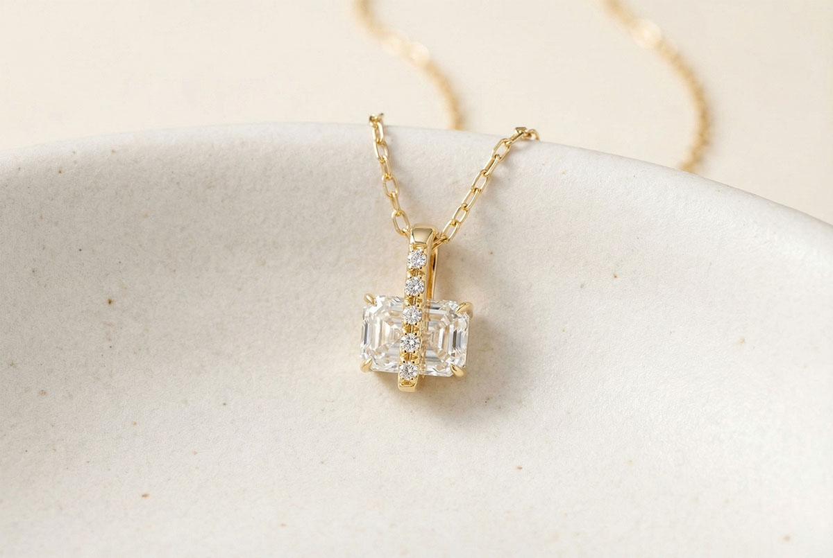 Un diamant de 1 carat tăietură smarald se află în centrul atenției, acompaniat de cinci diamante suplimentare, sertizate pentru a pune în valoare bijuteria cu echilibru și strălucire.O piesă grafică și îndrăzneață, creată pentru a captiva privirile.