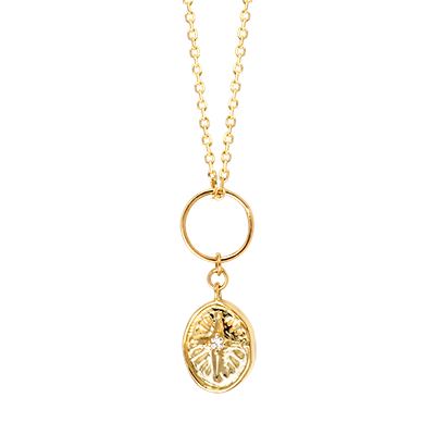 Un medalion solar, suspendat delicat de un inel din aur, ca o rază de lumină ce îți încântă decolteul. Fin gravat în formă de soare radiant, este iluminat în centru de un diamant strălucitor. O bijuterie simbolică și luminoasă, ce capturează lumina și încălzește orice siluetă.