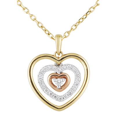 O trilogie de inimi în abis, mobile şi diafane, cu o inimă din aur galben, o inimă pavată cu diamante şi cu un diamant central încrustat în 3 gheruţe înconjurat de o inimă din aur roz.
