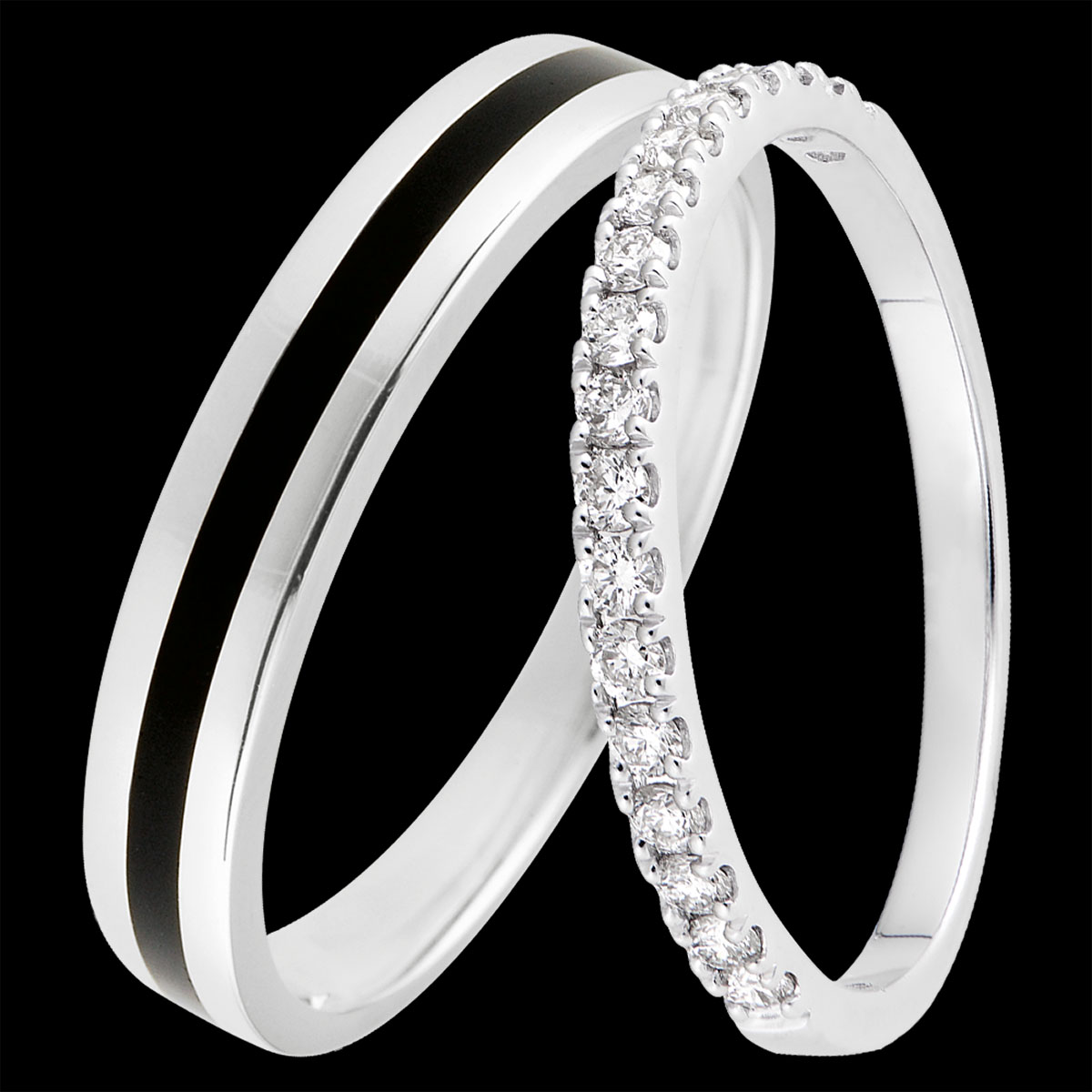 Un set elegant de verighete pentru ea & el. Pentru ea: verighetă semi-pavé cu 18 diamante (0,26 carate). Pentru el: verighetă bombată din aur alb, traversată de o bandă de lac negru.