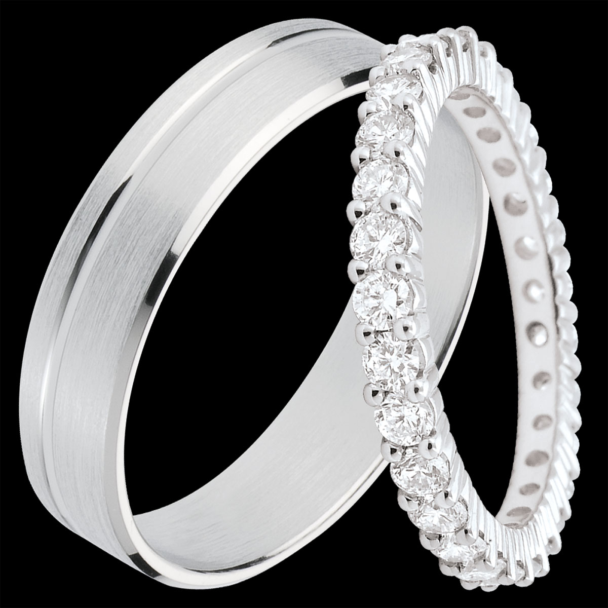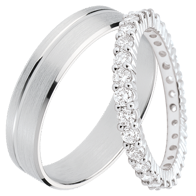 Un elegant duo de verighete pentru ea & el. Pentru ea: o verighetă completă, cu 29 de diamante rotunde montate în gheare, totalizând 1.11 carate. Pentru el: verighetă mată traversată de benzi strălucitoare.