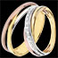 Amestecul echilibrat a trei nuanţe de aur subliniat de un pavaj de diamante în aurul alb. Acest inel 3 nuanţe de aur şi diamant este o bijuterie ce poate deveni verighetă sau cadou excepţional.