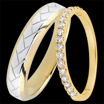 Un cuplu elegant de verighete pentru ea & el. Pentru ea, un inel semi-pavat cu 18 diamante strălucitoare (0,26 ct). Pentru el, un inel din aur galben cu margini teșite și un motiv împletit din aur alb în centru. Alegerea perfectă pentru cei ce prețuiesc rafinamentul.