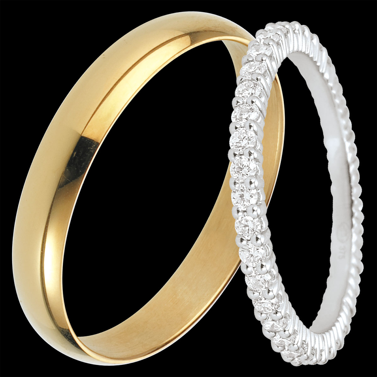 Un set elegant de verighete pentru ea & el. Pentru ea, un inel complet cu 38 de diamante totalizând 0,57 ct. Pentru el, o verighetă din aur galben, lustruită, cu lățimea de 3,5 mm.
