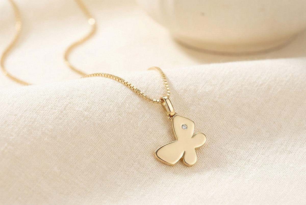Un fluturaş din aur galben cu forme rotunde şi blânde a cărui aripă este decorată cu un diamant. Model mare