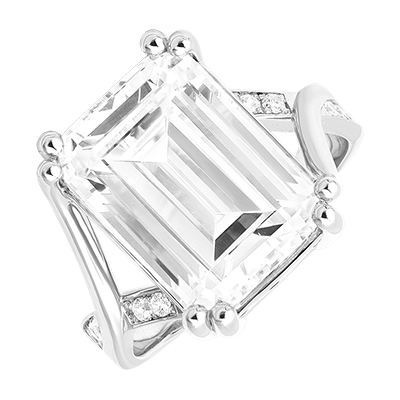 O bijuterie rafinată: inelul Altaé din aur alb reciclat pune în valoare un diamant sintetic tăiat smarald de 10 carate, evidențiat de un inel pavé cu structură arhitecturală.O piesă sculpturală pentru cele care apreciază liniile ferme și volumele îndrăznețe.