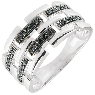 Trei linii de aur punctate separate de linii de diamante negre. Un inel Clar Obscur modern şi feminin.