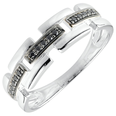 Două linii de aur punctate separate de linii de diamante negre. Un inel Clar Obscur modern şi feminin.