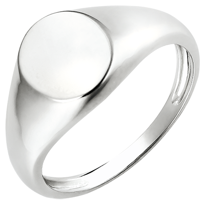 Un inel cu sigiliu din aur alb cu placă ovală. O bijuterie simplă și elegantă în același timp.
