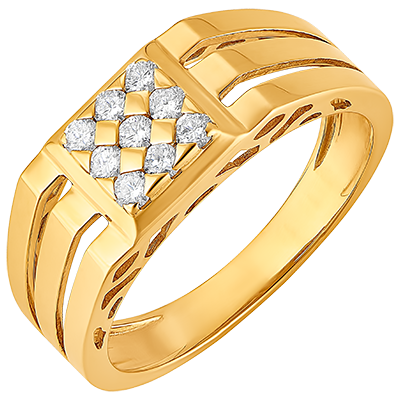 Un inel a cărui bază din aur galben este decupată cu delicatețe și al cărui centru este bogat pavat cu 9 diamante.