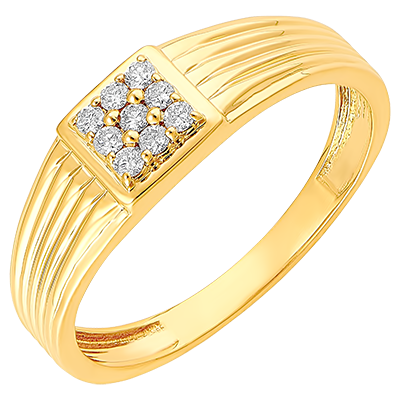 Un inel cu sigiliu a cărui bază din aur galben este delicat canelată și al cărui centru este generos pavat cu 9 diamante.