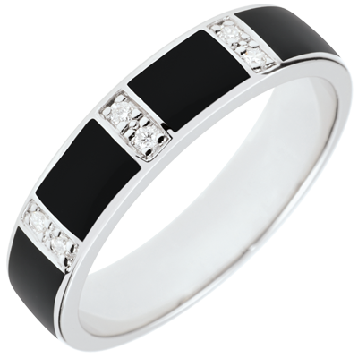 O bandă lată de aur alb toată în lac negru este străbătută de trei benzi de aur alb încrustate cu diamante.