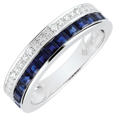 Un inel elegant din aur alb al cărui pavaj central de safire albastre este subliniat de un şir de diamante şi flori de aur.