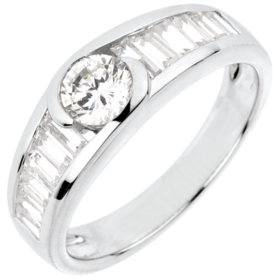 Un diamant solitaire este ţinut într-o somptuoasă montură încrustată cu diamante tăiate baghetă.