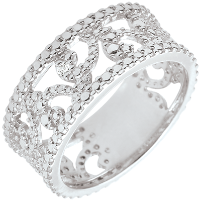Arabescuri în aur alb lucrat stil diamant sculptează acest inel feminin şi elegant.