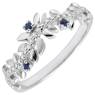 O alternanţă de frunze de aur alb strălucitoare şi de frunze cu lustru periat manual într-un inel romantic încrustat cu diamante şi safire.
