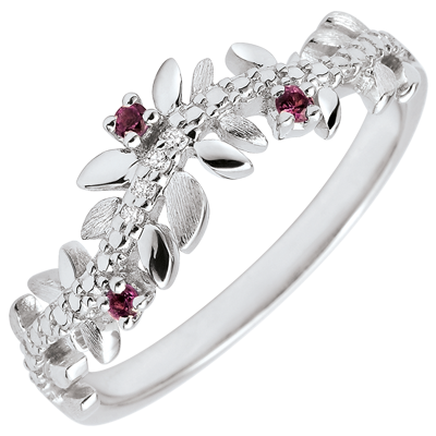O alternanţă de frunze de aur alb strălucitoare şi de frunze cu lustru periat manual într-un inel romantic încrustat cu diamante şi rodolit.